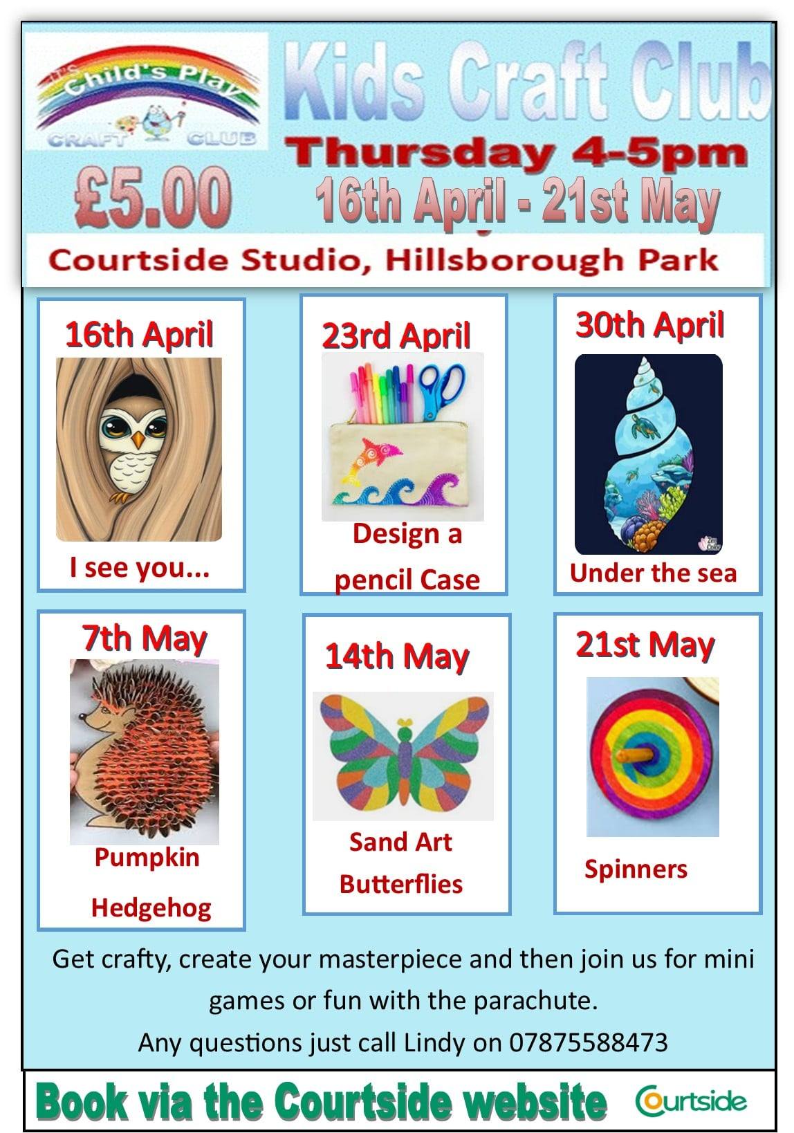- On Thursday evenings we run a Kids Craft club at the Courtside Studio in Hillsborough Park. We offer a varied range of activities in different media. The children love it and parents get the chance to have a coffee and a bun in peace!