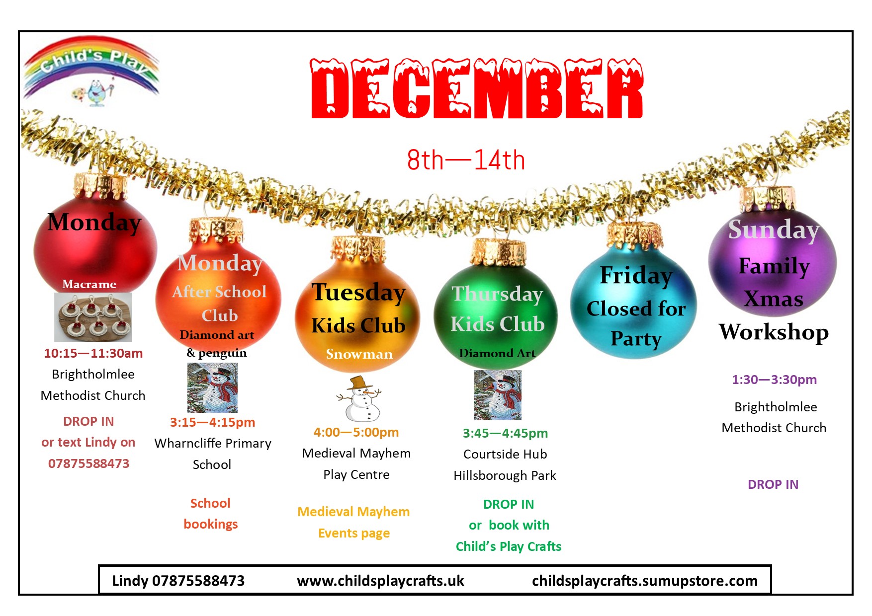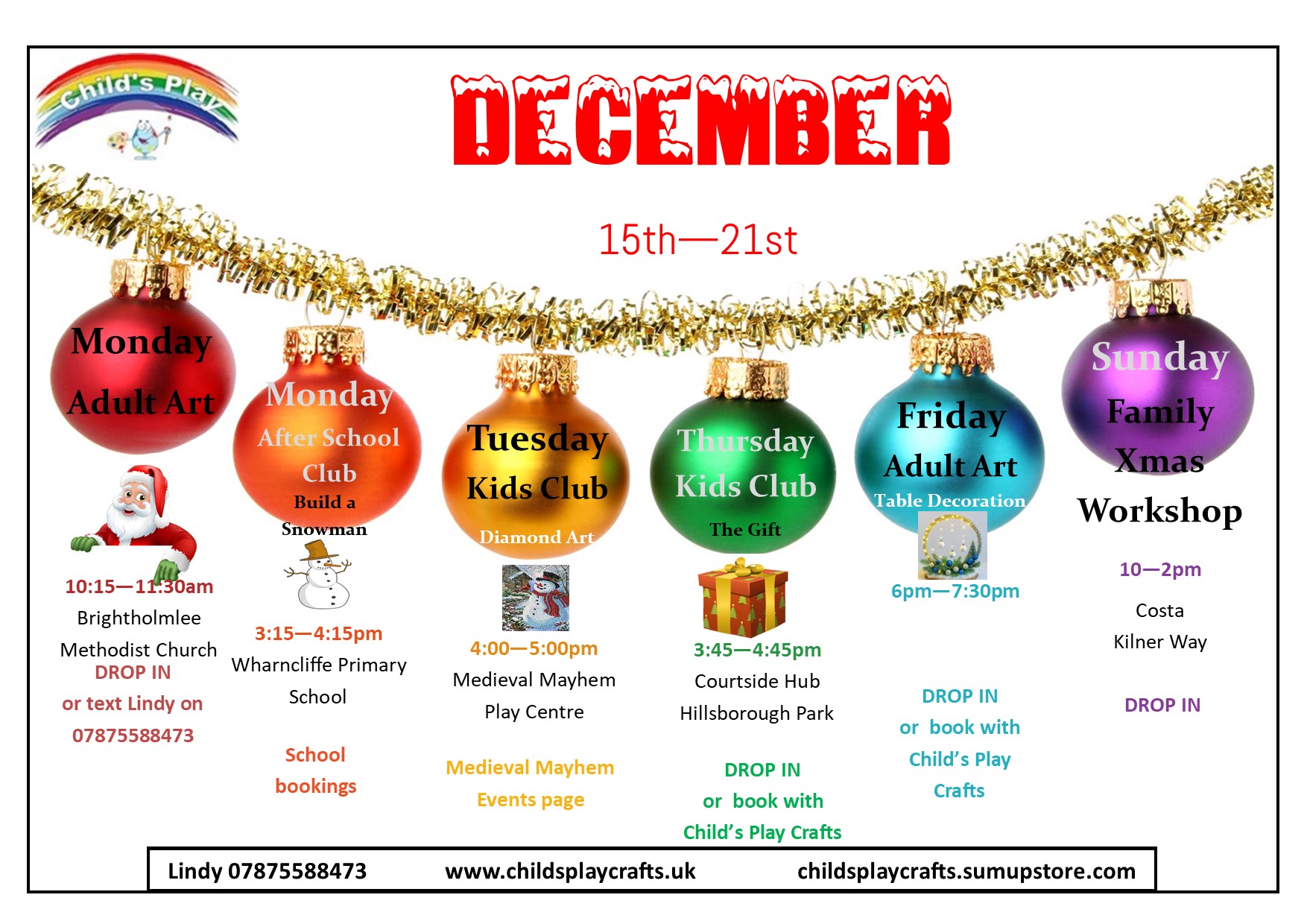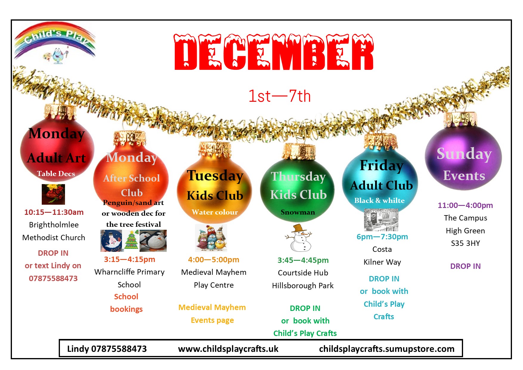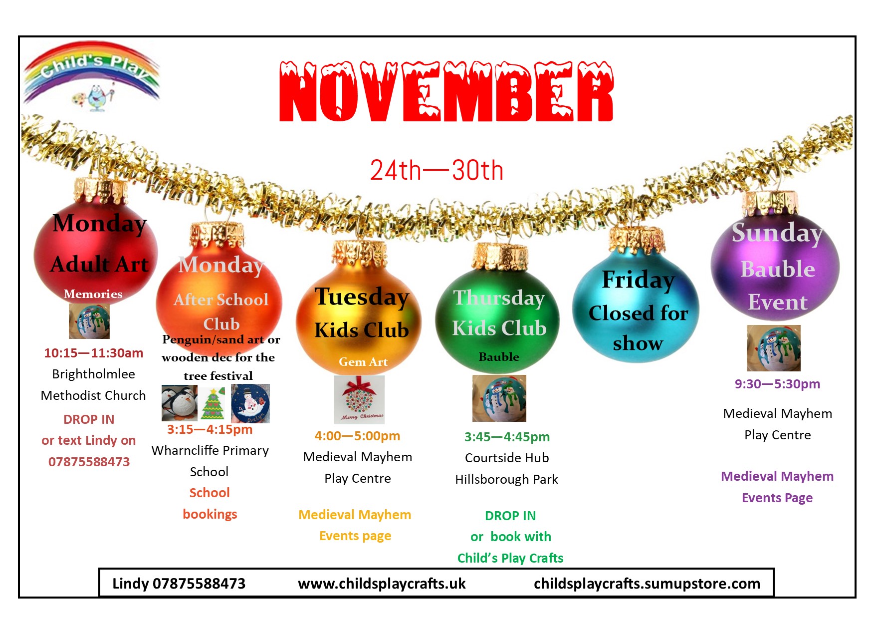 It seems like we are going to be everywhere over the next few weeks! November and December are always a busy time for Child's Play, but this year we are staging craft and art workshops for young and old, running stalls at events, hosting the odd party and in between all of this holding our regular and ever-popular bauble sessions.