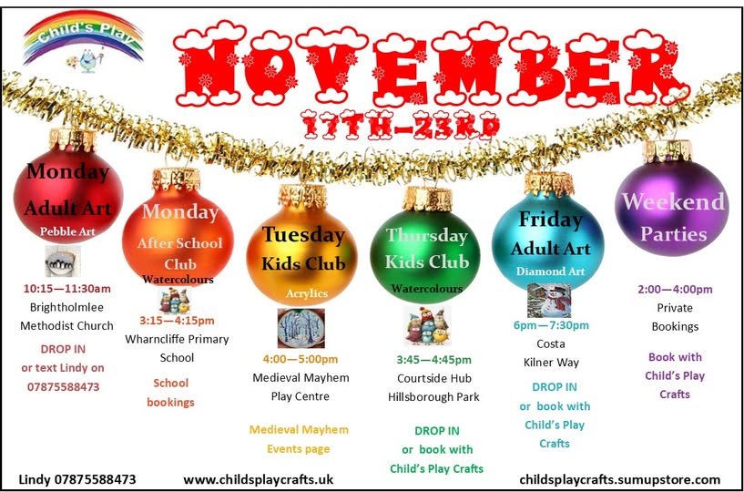It seems like we are going to be everywhere over the next few weeks! November and December are always a busy time for Child's Play, but this year we are staging craft and art workshops for young and old, running stalls at events, hosting the odd party and in between all of this holding our regular and ever-popular bauble sessions.